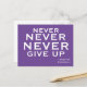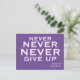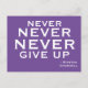 Motivational postcard featuring the words of Winston Churchill. Never, never, never give up. Purple postcard with crisp white typography.