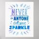 "Never let anyone dull your sparkle," hand-lettered in a quirky and whimsical style and painted in watercolor for a handmade touch. Inspirational and motivational quote poster. Original design. Author unknown.