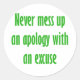If you believe in not making excuses, then you'll love this item. Reads "Never mess up an apology with an excuse." A good inspirational quote about not making excuses!