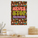 Encapsulating a retro, vintage aesthetic, blending vibrant colours and intricate patterns to convey the message of continuous growth and progress. At its core lies a captivating background adorned with a whimsical pattern of colourful mushrooms, symbolising the stages of growth and development. The typography, reminiscent of vintage posters, takes centre stage with the bold motivation "Never Stop Growing." Rendered in a stylised font, the words exude confidence and determination, urging viewers to embrace personal and professional advancement relentlessly. Overall, this design serves as a timeless reminder to embrace the journey of growth, to persevere through challenges, and to never lose sight of one's potential.