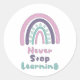It features a colourful boho rainbow with a motivational short quote (Never stop learning).