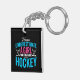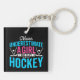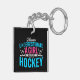 Text of hot pink, bright blue, and white with hockey pucks and hockey sticks reads Never Underestimate a Girl Who Plays Hockey, great for the hockey player of every age who loves the sport!