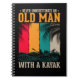 Funny kayak design on T-shirts and more, great for anyone who loves kayaking, features a kayaker on a rolling river and text that reads Never Underestimate an Old Man With a Kayak!