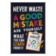 This vibrant and motivational "Never Waste a Good Mistake" poster is designed to inspire a growth mindset and self-reflection in students and individuals alike. The colourful text and fun imagery, including a pencil and question marks, encourage viewers to learn from mistakes and view them as opportunities for growth. Ideal for classrooms, offices, or any space where motivation and personal development are prioritised. A reminder that mistakes are simply steps on the path to success.