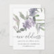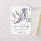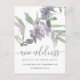 Beautiful floral and greenery new address announcement features pretty calligraphy script and delicate purple watercolor flowers with new address information.