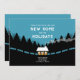 Change of address announcement in blue and black, featuring a cosy little cabin in the woods with windows and a retro style forest with pine trees.