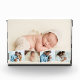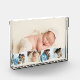 Create your own unique baby photo block. The photo template is set up ready for you to add 5 of your favourite pictures which will automatically display as one main background photo in landscape format, with the remaining 4 photos overlaid in a zigzag montage. The design has narrow white photo frames.
