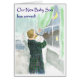 A new baby boy announcement card with a father holding a new baby in the middle of the night, looking out at the moon through the window; from a watercolour painting by Judy Adamson. The less expensive option of using this design on a postcard is available.