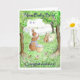 A 'New Baby Boy' Congratulations card with a rabbit hanging out the laundry on the line and a group of smaller rabbits admiring the new arrival in its pram. From a handpainted watercolour by Judy Adamson. Blank inside for your own message.