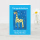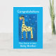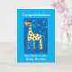 'Congratulations you have a new baby brother' text on a photo of a child painted giraffe.