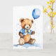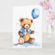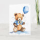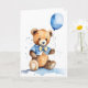 Cute watercolor illustration of a baby boy teddy bear with a blue balloon and bow ties on a white background.