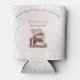 This sweet floral can cooler is for a baby shower event, with the theme 'New chapter'. Features illustrations of a watercolor stack of floral decorated books and the background is light blush pink peonies in a soft colour. Classic old english text style font for a feeling of old kids illustration books.