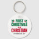 Stylish FIRST CHRISTMAS AS A CHRISTIAN New Believer keychain with CUSTOMIZABLE TEXT & DATE. Design shows Christmas green and Christmas red bold sans serif typography with red and green holly elements. A great festive keychain for a new Christian believer. You can PERSONALIZE THE TEXT with your name, favourite Bible verse, or other text and year (or delete). Ideal as church Christmas merchandise for new believers celebrating their first Christian Christmas. These can be given as stocking stuffers and favour gifts. Matching gifts available.