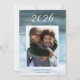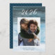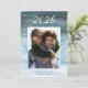 Elegant New Year photo cards feature your favorite photo framed by a watercolor wash background in rich ocean blue. The year appears at the top in calligraphy lettering, with your custom greeting and names beneath.