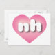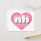 This postcard features a pink heart with a white-washed centre containing the white rounded lower case letters nh, a playful abbreviation for New Hampshire, the granite state. The reverse side of the postcard is blank, awaiting your handwritten sentiments or customised text.