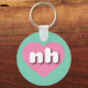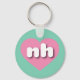 This keychain features a vibrant pink heart containing the bold, white, rounded lower case letters nh, a playful abbreviation for New Hampshire, the granite state.