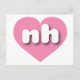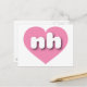 This postcard features a vibrant pink heart containing the bold, white, rounded lower case letters nh, a playful abbreviation for New Hampshire, the granite state. The reverse side of the postcard is blank, awaiting your handwritten sentiments or customised text.