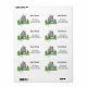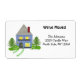 Showing a home address label featuring a cosy, stylish house with a grey roof and blue siding, complemented by trees and a pathway. Personalise it with your information as desired.