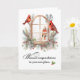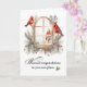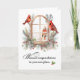 bright red cardinals perched on a rustic arched window, accented with pine greenery and red berries. This thoughtful card is perfect for celebrating the joy of a new place in the winter season. Whether it is an apartment, house, townhouse or patio hime, its cosy woodland style makes it ideal for sharing heartfelt wishes with friends, family, or neighbours as they begin a new chapter.