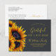 Modern simple elegant Thanksgiving family moving announcement postcard featuring a beautiful yellow orange sunflowers bouquet and a gold chic typography script on a dark background.