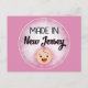 This funny postcard features a cute white baby face that says "Made In New Jersey" on a Pink background. Perfect for new baby announcements or just for fun.