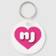 This keychain features a shapely and vibrant hot pink heart containing the bold, rounded, white lower case letters nj, a playful version of the abbreviation for the state of New Jersey.