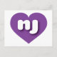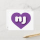This postcard features a shapely and vibrant purple heart containing the bold, white, rounded lower case letters nj, a playful abbreviation New Jersey, the garden state. The reverse side of the postcard is blank awaiting your handwritten sentiments or customised text.