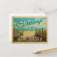 This Greetings From New Jersey vintage postcard design features a sandy beach with a beautiful turquoise ocean water and above the sea, a blue sky with billowy white clouds. In vintage travels style.