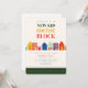 Neutral baby shower invitation featuring illustration of a row of houses with pink, blue, red, green, orange, and yellow colour palette.