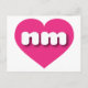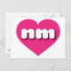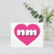 This postcard features a vibrant hot pink heart containing the bold, white, rounded lower case letters nm, a playful abbreviation for New Mexico, the land of enchantment. The reverse side of the postcard is blank, awaiting your handwritten sentiments or customised text
