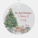 Our First Christmas as Mommy & Daddy holiday ornament keepsake. The design features a lit christmas tree with crib and gift wrapped presents. Perfect keepsake gift for new parents celebrating the first christmas with their firstborn child.