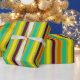 This bright wrapping paper features bold stripes in shades of green, purple, orange, blue and yellow from our New Retro colour palette.