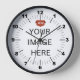 I received this as a birthday gift from my husband to replace a clock that had broken. It was perfect, pictures of my sweet family to see at every hour of the day. The size of the pictures looks nice for the size of the clock and I love looking at it! The only downside is there is no cover for the battery on the back, which makes me nervous having little kids running around the house, but an easy fix with some tape. The printing turned out clear, considering they were all cell phone pictures. Some of them look slightly grainy upon getting close up. But so nice overall!