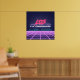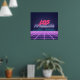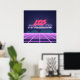 A new retro wave Los Angeles floats above a pink neon grid and blue and green neon mountains. It's hella 80's lookin'.