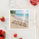 Tropical island shoreline meets the azure sea under a bright sun, with "2026" etched into the sandy beach