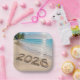 Tropical island shoreline meets the azure sea under a bright sun, with "2026" etched into the sandy beach