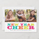 A fun New Year Cheer type treatment sits below three photos on this colorful Happy New Year holiday card. Send wishes for a wonderful 2021 with this festive card that features a distressed retro font in shades of vivid neon colors.