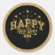 This round sticker is shown with a Happy New Year stars print with a gold faux glitter border.