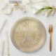 These glamourous custom party plates feature a festive New Year's eve theme. The background features a shiny looking faux gold foil design. Two sparkling champagne glasses are printed across the centre. A golden new year clock is printed in the background.