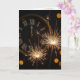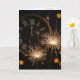 Two sparklers shine brightly in the foreground, while a blurred clock showing New Year's midnight is visible in the background