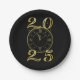 New Years Eve Party Black and Gold paper plates featuring a 2025 faux gold countdown to midnight clock.
