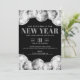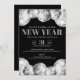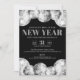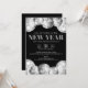 Black And White New Year's Eve Celebration Party Invitation. Celebrate the new year with this modern invite featuring a black background on both sides for a sleek, dramatic look. The front includes bold gray disco balls at the top and smaller matching disco balls along the bottom for a festive touch. Crisp white and soft gray serif fonts keep the layout clean, stylish, and easy to read, without any shimmer or shine.