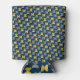 This can cooler has a mid-century modern design of ovals in navy with semi-circles in shades of yellow and shades of grey in them on a field of black.
