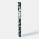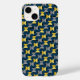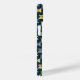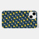 This phone case has a mid-century modern design of ovals in navy with semi-circles in shades of yellow and shades of grey in them on a field of black.