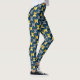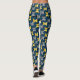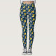 These leggings have a mid-century modern design of ovals in navy with semi-circles in shades of yellow and shades of grey in them on a field of black.