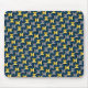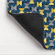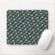This mouse pad has a mid-century modern design of ovals in navy with semi-circles in shades of yellow and shades of grey in them on a field of black.