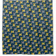 This shower curtain has a mid-century modern design of ovals in navy with semi-circles in shades of yellow and shades of grey in them on a field of black.