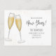 This design features a simple new years eve day, party champagne wine celebration festive, trendy stylish gold bubbly toast, a watercolor champagne flute glasses glass, an elegant calligraphy script text font, a whimsical typography style design, a modern Christmas holiday glitter, a classy-vintage retro cute simplistic, family friends get together party, a bubbly festive budget friendly postcard