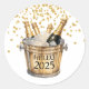 A modern hello 2025 New Year's party sticker, featuring a bucket of champagne, and gold glitter confetti white background. Simple modern elegance. Customise for any year.