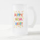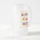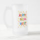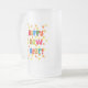 A New Year's Frosted Glass Mug with 'Happy New Year' in multicoloured letters and orange and yellow starts scattered all over the whitebackground. From a handpainted paper collage design by Judy Adamson.